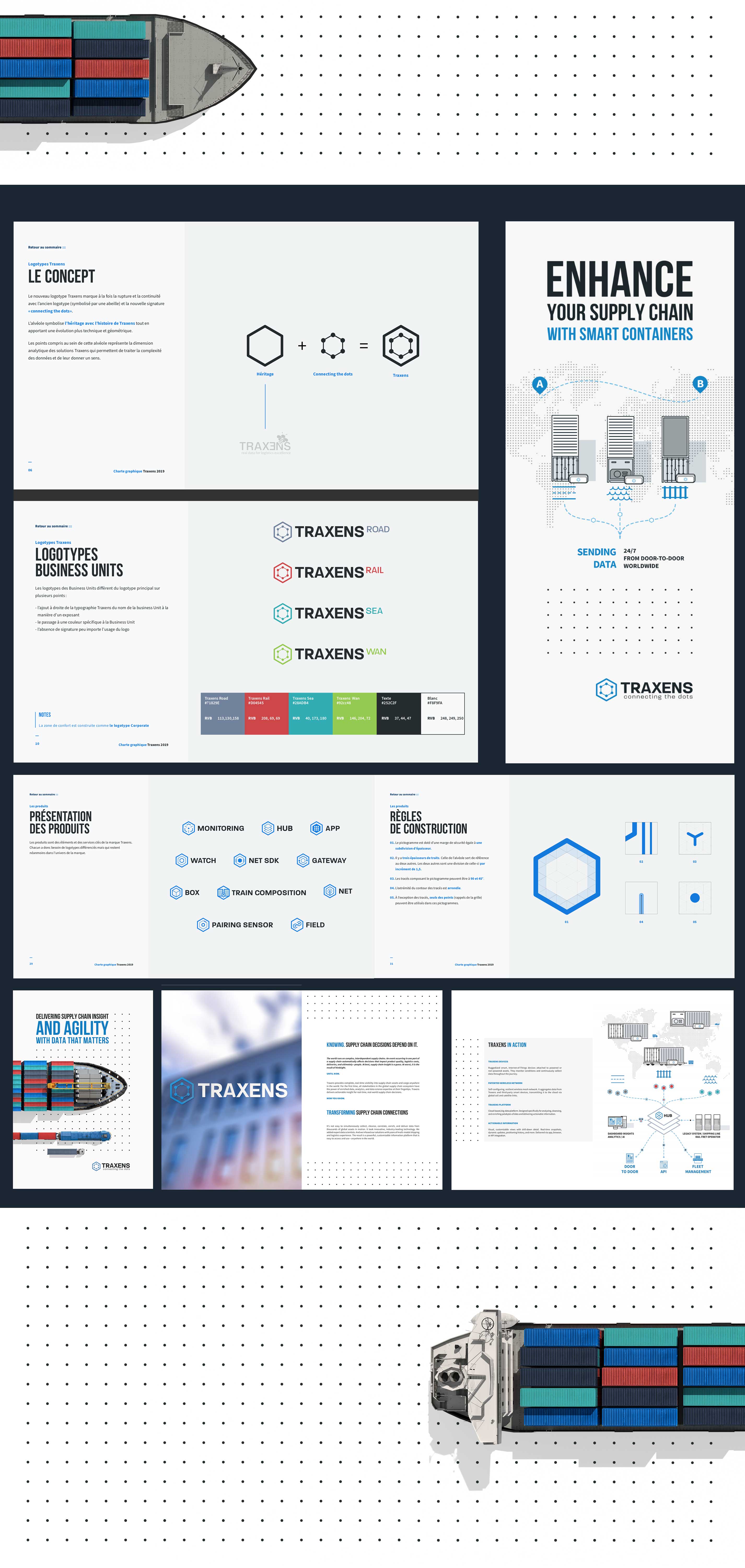 Traxens nous a consulté pour les accompagner dans la refonte complète de leur charte graphique. L’objectif pour nous était de matérialiser le nouveau positionnement de la société tout en soutenant leur nouvelle signature « Connecting the dots ». L’enjeu principal de ce projet était de marquer à la fois la rupture et la continuité avec l’ancienne image de Traxens.